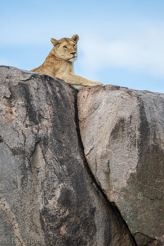 In the Serengeti you want to see the cats on the kopjes (stone outcrops), ideally at sunset with a dramatic sky. Sadly we did see lions on kopjes but sunset shots were limited as were the dramatic skies. One evening we spent hours with three female lions only to have one of them dash our hopes when she turned away from a ledge where we had positioned for a good composition. Such is wildlife shooting.